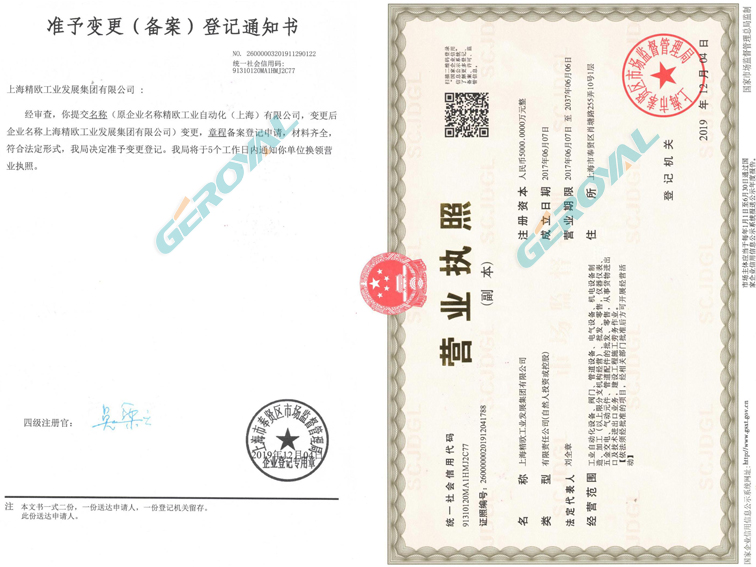 由于业务发展需要,从2019年12月1日起,原精 欧工业自动化(上海)有限公司 名称变更等级为 上海精欧工业发展集团有限公司 。12月1日起,公司所有对内以及对外文件、资料、开具发票等全部使用新名称(原账号、税号保持不变),公司名称变更后,业务主体以及法律关系不变,原签订合同继续有效,原有的业务关系和服务承诺保持不变。因公司名称变更给广大客户带来的不变敬请谅解,我们将会一如既往的为您提优质的服务!