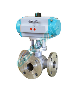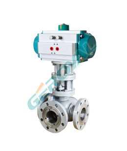 气动三通球阀是一种三通道的回转型球阀, 用于介质分流、合流及流向切换,任何一个管道都可以作为入口或出口。气动三通球阀分有气动三通L型球阀和气动三通T型球阀两种,可以满足不同的生产工艺要求。气动三通L型球阀是对三条管道中的两条管道进行切断,气动三通T型球阀实现把三条连通管道进行合流与分流。气动三通调节球阀与电气阀门定位器配套,输入4~20mADC信号及0.4~0.7MPa气源即可控制运转,实现对压力、流量、温度、液位等参数的调节。气动三通换向球阀配行程限位开关、电磁阀、减压阀及0.4-0.7MPa气源可实现开关操作,并送出二对无源触点信号指示阀门的开关。气动三通球阀广泛应用于化工,石油,轻纺,电力,食品制药,制冷,航空,航天,造纸等工业领域。